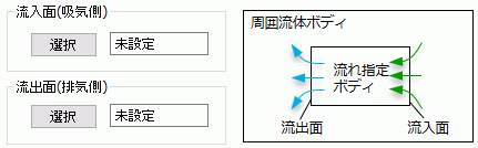 流量指定: 面の法線方向の体積流量を指定します。 方向・分布入力を指定した場合、体積流量に加えて「方向ベクトル指定」が選択可能です。