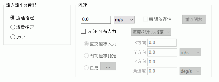 流速指定: 面の法線方向の流速を指定します。 方向・分布入力を指定した場合、流速に加えて「方向ベクトル指定」あるいは「速度ベクトル指定」が選択可能です。