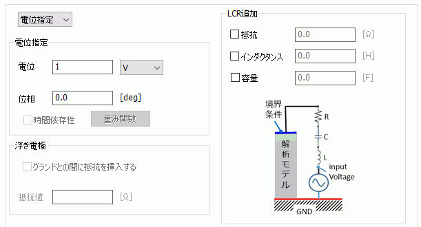 ダイアログに図で示したように、入力電圧と境界条件の間にLCRが挿入されます。 その為、LCRのいずれかが挿入された解析結果では、境界条件位置での電位が指定した値からずれます。