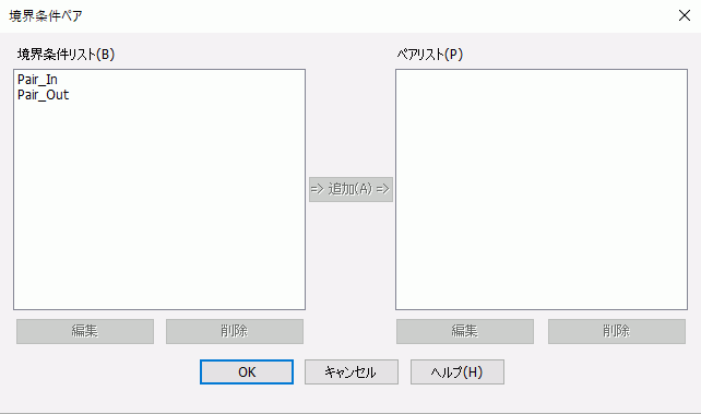 境界条件リストから、ペアとなる境界条件を選択し、追加ボタンを押すと、 境界条件ペアの編集ダイアログが起動し、[OK]を押すと境界条件ペアが作成されます。 |