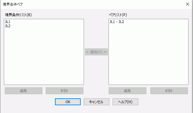 境界条件リストから、ペアとなる境界条件を選択し、追加ボタンを押すと、 境界条件ペアの編集ダイアログが起動し、[OK]を押すと境界条件ペアが作成されます。 |