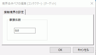 登録されている、境界条件のペアを表示します。ダブルクリックすると以下に示す、 境界条件ペアの編集ダイアログが起動し、境界条件ペアに関連する設定項目 (接触境界の場合は摩擦係数)を編集できます。 [Delete]キーを押すと境界条件ペアが削除されます。 |