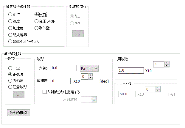 境界条件の種類で入射境界である、圧力/変位/速度/加速度、を設定した場合に、それらの入射波形の設定を行います。