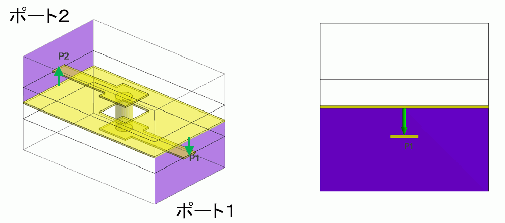 平面につけられており、図の右図はポート1の拡大図になります。ポートの構造はマイクロストリップ線路