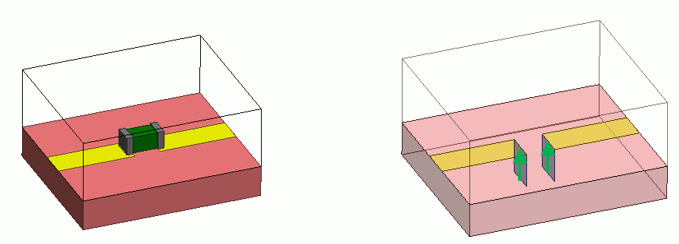 図10にあるような信号線がモデル外側まで伸びていないコプレーナ線路を考えます。このモデルは誘電体からなる