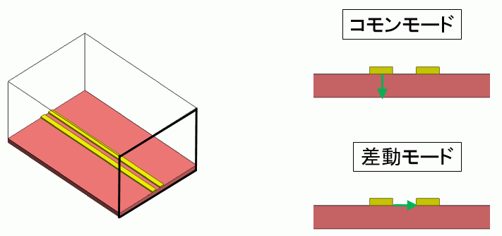 電を行うモードです。一方差動モードは2つの伝搬モードの”差”に対応するモードで、信号線間に電界を