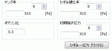 注: ヤング率の仮数部に入力できる値は0より大きい実数です。 ポアソン比の仮数部に入力できる値は0~0.5の実数です。 ひずみ硬化率は0より大でかつヤング率よりも小の値の範囲で設定可能です。 初期降伏応力は0より大である必要があります。
