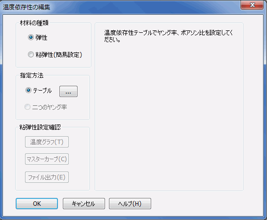 以下のようなダイアログが表示され、温度依存性を[テーブル]で入力するか、[二つのヤング率]で入力するかを選択することが出来ます。
