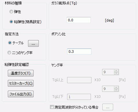 材料の種類で、弾性体として扱うか、粘弾性体として扱うかを選択することができます。 通常の粘弾性材料は、「粘弾性タブ」で設定しますが、ここでは、温度依存性データのみの簡易設定から 粘弾性簡易設定についての詳細は「粘弾性(簡易設定)について」を参照してください。 (注)粘弾性(簡易設定)は特別オプション機能です。