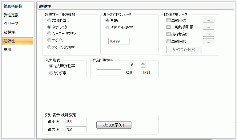 超弾性なし、ネオ・フック、ムーニー・リブリン、オグデン、オグデン発泡材のいずれかを選択します。