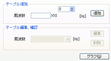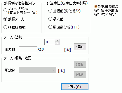 [テーブル追加]で周波数を入力し、 [テーブル編集、確認]では、入力済みのテーブルの確認、編集、削除ができます。 [グラフ]ボタンをクリックすると、周波数毎の磁束密度-損失密度のグラフが表示されます。