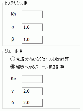 鉄損を磁束密度と周波数からなる経験式を使用して算出します。 経験式の係数を入力します。