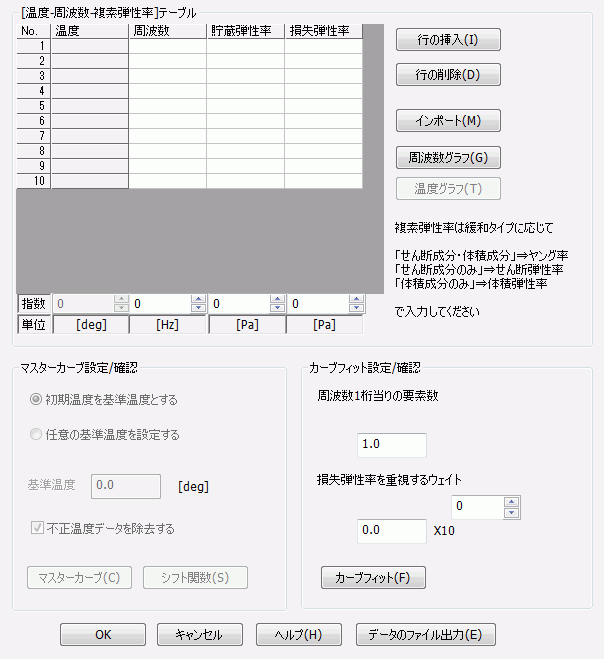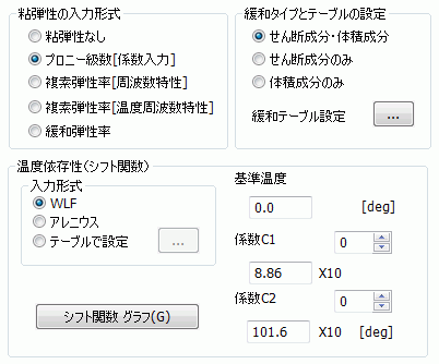 粘弾性の入力形式がプロニー級数[係数入力]、複素弾性率[周波数特性]、複素弾性率[温度周波数特性]、緩和弾性率の場合に入力できます。