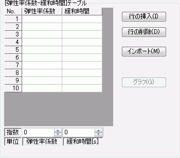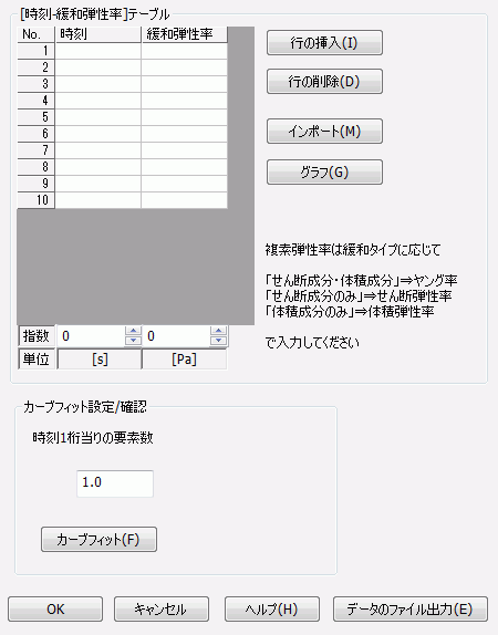 粘弾性の入力形式が緩和弾性率のときに緩和テーブルボタンをクリックすると以下のダイアログが表示されます。