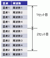 ・入力データは緩和タイプに応じて設定する(上記表参照) ・周波数の入力順は、昇順、降順どちらでも良いがテーブル内で統一させる ・1セット中の温度データは、一定が好ましいがばらつきを含んでいても良い(1セット内の平均値を代表温度として扱います) ・温度の入力順は、昇順、降順どちらでも良いがテーブル内で統一させる