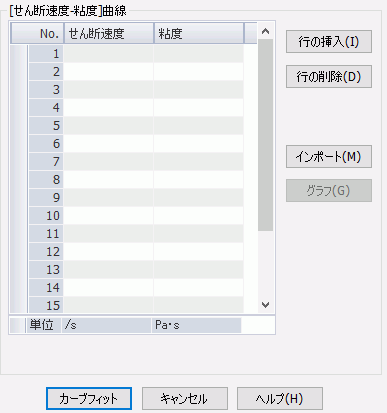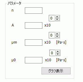 グラフボタンをクリックすると入力した非線形曲線のデータがグラフ表示されます。 グラフを描くときは[温度] データ、[粘度] データともに、各々最低2個以上 のデータが必要です。 |