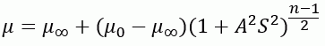 Carreauモデルでは画像中の数式(Sはせん断速度[/s])により粘性係数を計算します。 せん断ひずみ速度S→0でμ0、S→∞でμ∞となり、それぞれ粘度の上限値、下限値を示します。n,Aはパラメータで、n=1のときニュートン流体となります。