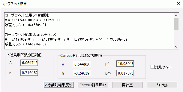 カーブフィットの結果がウィンドウに表示されます。 「べき乗則結果反映」ボタン:カーブフィット結果を 粘度モデル/べき乗則 のパラメータに自動反映します。 「Carreau結果反映」ボタン:カーブフィット結果を 粘度モデル/Carreauモデル のパラメータに自動反映します。 「再計算」ボタン:「べき乗則係数の初期値」、「Carreauモデル係数の初期値」欄の各係数の初期値を設定して再計算できます。