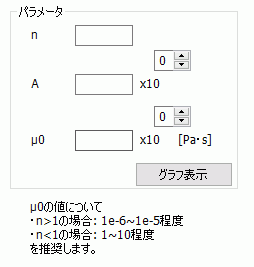 べき乗則では画像中の数式(Sはせん断速度[/s])により粘性係数を計算します。n=1ではニュートン流体、n>1で水溶き片栗粉などのダイラタント流体、n<1では射出成型時の液状樹脂などの擬塑性流体を示します。 n,Aはパラメータ、μ0はダイラタント流体における下限値、擬塑性流体における上限値です。