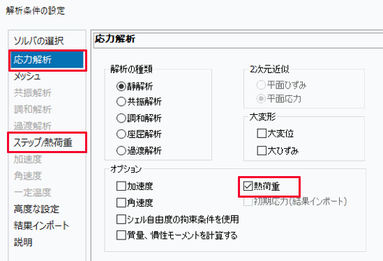 応力解析の設定は以下のように行います