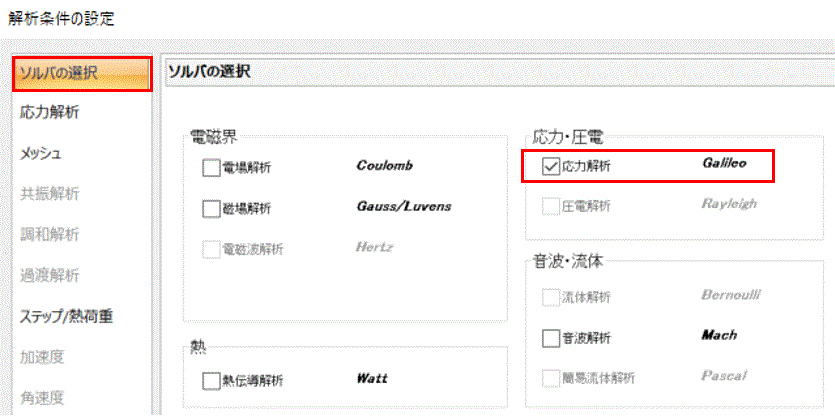 [ソルバの選択]タブで[応力解析 Galileo]にチェックします。
