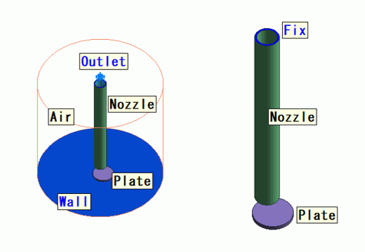空気領域の上部に筒状のノズルと、空気領域の底面に円盤状の物体を配置します。