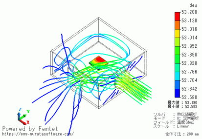以下に、流線と発熱体の温度分布コンタ図を同時表示したものを示します。ケースのコンタ図フィールドは非表示としています。