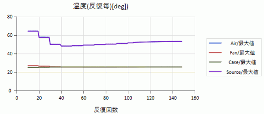 あらかじめモニター値として登録しておいた、ファンの体積流量の推移と各ボディ属性の最高温度の推移を示します。