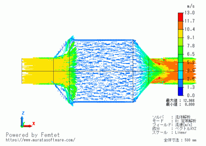 多孔質内部は平均化された流速が表示されます。(多孔質の隙間を流れる流速は、空隙率に応じてもっと高い値になります。)