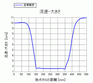 また、座標(0,0,0)から座標(500,0,0)までの流速をグラフ化したものを示します。