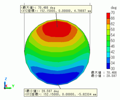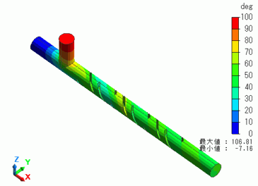 エレメントなしでは、29[deg]~70[deg]であるのに対して、エレメントありでは、43[deg]~59[deg]の範囲になっており、エレメントありの方がよく混合されていることが分かります。