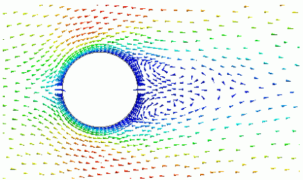 円柱周囲の流速分布のベクトル図を示します。