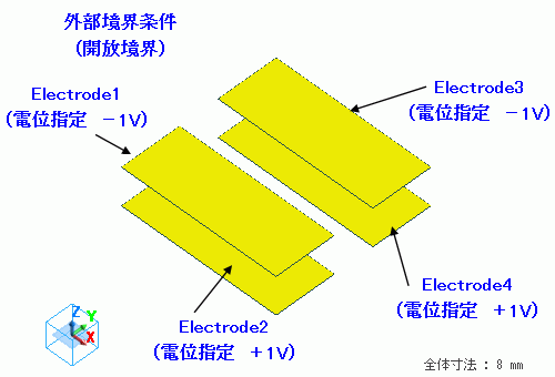 本例題では電位差を有する4枚の平板が配置されている状態を電場解析します。