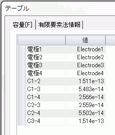 それぞれの電極間の静電容量は、[解析結果]タブの、