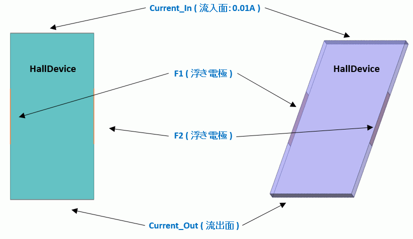 Current_Inには印加電流を設定し、Current_Outを電流の流出面とし、F1,F2は浮き電極とします。