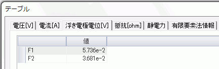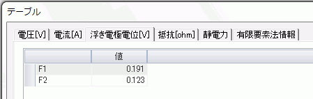 浮き電極F1,F2の電位の解析結果は、[解析結果]タブの、