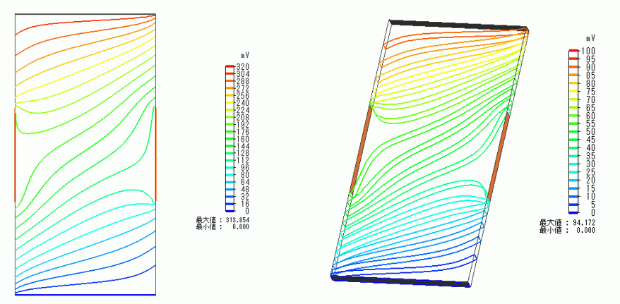 ホール効果によって電位分布、電流分布双方にひずみが発生していることが分かります。