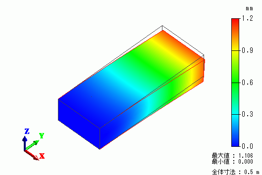 先端に分布荷重が印加され変形した片方固定の直方体形状の梁の応力解析した例を示します。