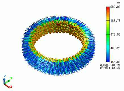 リングの変位分布や応力分布を解析結果として見ることができます。
