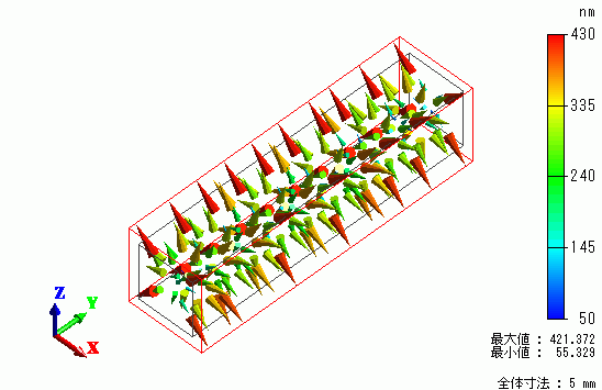 変位ベクトルを示します。カラーバー変位の大きさを示してます。