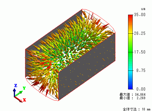 温度上昇によって熱膨張が発生していますが、等変位(グレー部分)についてはX方向に変位はしていますが、面そのもの