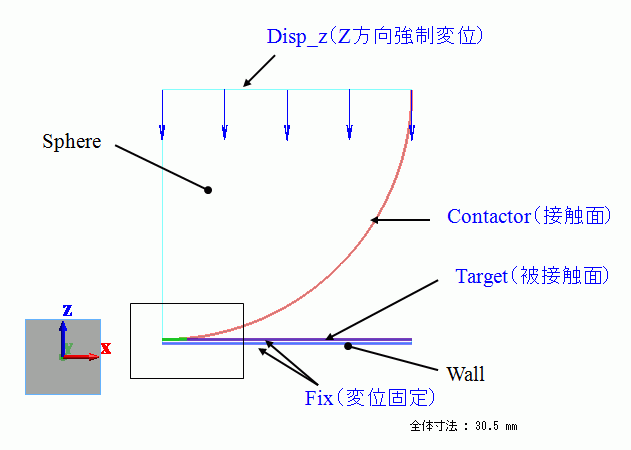 半径30mmの球に対して微小変位として0.1mmのZ軸マイナス方向の変位(Disp_z)を設定しています。