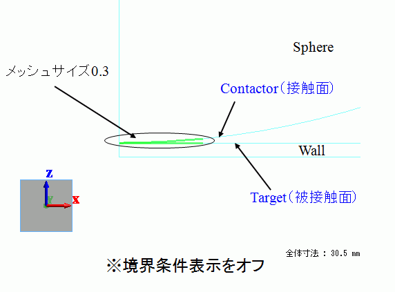 球体、剛体平面ぞれぞれのボディにX=3mmにて辺を刻み、標準メッシュサイズ1.5よりも小さめのメッシュサイズ0.3を設定しています。