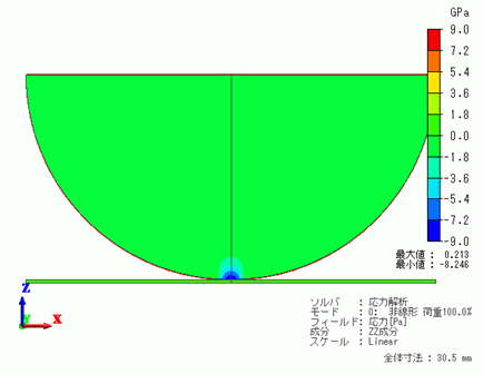 特に上の図で黄色の四角形で囲んだ対称軸(Z軸)上の接触点付近には局所的に応力が発生することが予想できますので