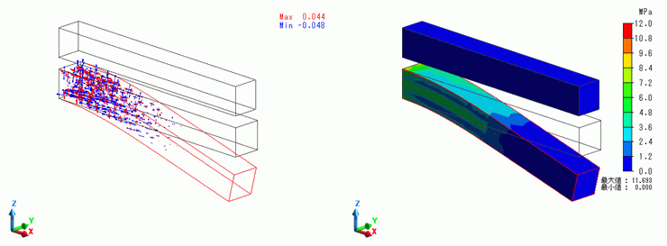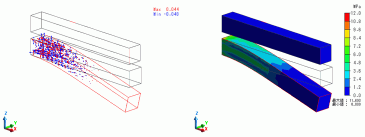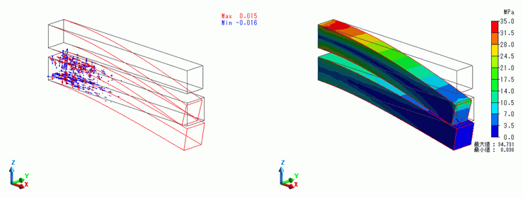 上の梁は、Z変位をなしにしているため、元の形状に戻っており、下の梁においては塑性ひずみが残留しています。