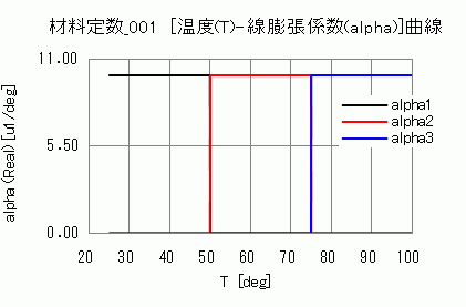 材料定数は以下のように設定しています。線膨張係数の温度依存性は25-50,50-75,75-100各温度範囲において