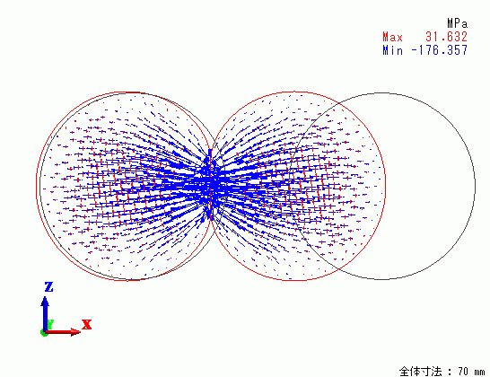2つのボディの接触部において変形が発生して応力が集中している様子が分かります。