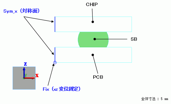 線膨張係数などが異なる材料(シリコンとガラエポ)をはんだで接合した構造の熱荷重解析をします。