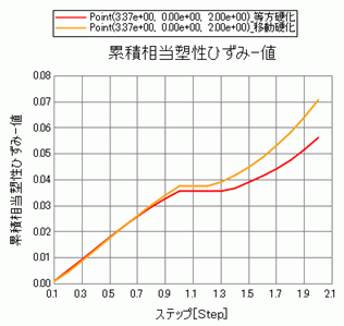 次にステップを横軸にして塑性ひずみの集中点付近での累積相当塑性ひずみを縦軸プロットしたグラフを示します。