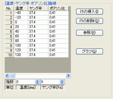 材料の種類: 弾塑性マルチリニア 塑性硬化則: 移動硬化 温度依存性: あり 材料定数: ヤング率ポアソン比温度テーブル: